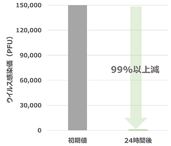 試験結果:24時間で、初期値から99%以上のインフルエンザウイルス(A型H1N1)抑制を確認。