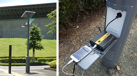 太陽光発電装置と蓄電池にLED照明を組み合わせた夜間照明用の街灯で、常時電源供給が不要です。商用電源を使用していないため、停電に影響されません。また非常時には、スマートフォン等への給電も可能です。