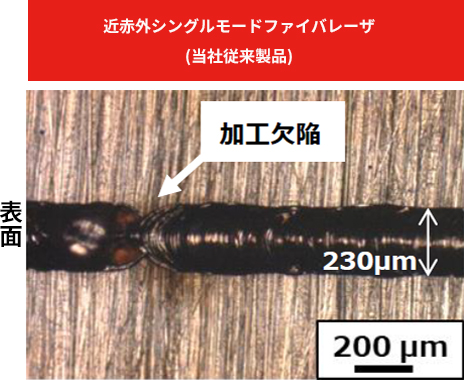 純銅板の表面にレーザを集光しながら純銅板を移動させ、加工特性(品質、溶け込み深さ、加工速度)を評価しました。表面の観察結果より、ハイブリッドレーザによる加工は、欠陥が無く安定しています。また、近赤外ファイバレーザと同等の溶け込み深さを高速で実現できております。室温において光吸収率の高い青色レーザ光で加熱後、輝度の高い近赤外レーザ光による加工を行うため、溶融部が安定し、高品質な加工が可能となりました。