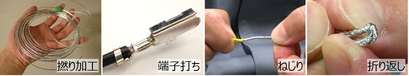 銅合金の開発などで培ってきた先端のメタル技術を適用し、既存品比で2倍以上となる世界最高水準の材料強度(線径44μmにて719N/mm2の引張強度(注1))まで高められる導電用アルミニウム合金線を開発しました。更にこの材料を応用し、高い疲労特性(図1)および、撚り加工性、端子接続性、展延性などの成形加工性と両立させることに成功しました(図2)。そして、信頼性への要求が最も厳しいエレベータ用ケーブルに本アルミニウム合金線材を適用した評価では、高い強度特性を反映し、既存の銅導体製ケーブルの6倍以上もの優れた屈曲寿命(900万回以上の繰り返し回数)を示しました。