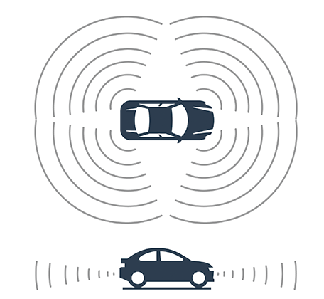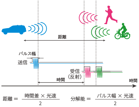 - 当社独自のパルス方式は、距離と相対速度を時間軸と周波数軸の2軸で検知するため、広角(±60°以上)かつ広範囲(0~75m)で、障害物・人・標識など複数物標を個別に検知することができます。