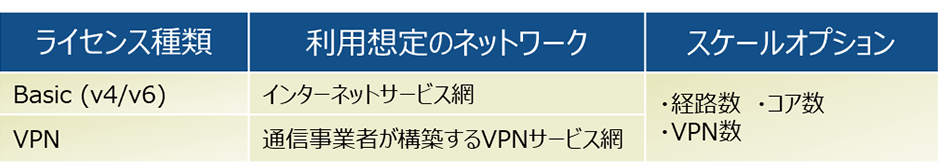 仮想アプライアンス製品のため、ハードウェアを自由に選択・拡張できます。また、ライセンスは、インターネットサービス網での利用を想定した「Basic(v4/v6)」ライセンスと、通信事業者が構築するVPN(Virtual Private Network)サービス網での利用を想定した「VPN」ライセンスを用意しており、用途に応じて選択でき、スケールオプションも用意しています。ネットワークの規模やニーズに応じた投資が可能となり、初期費用を抑えたスモールスタートでサービスの成長に合わせてスケールアップしていくことも可能です。