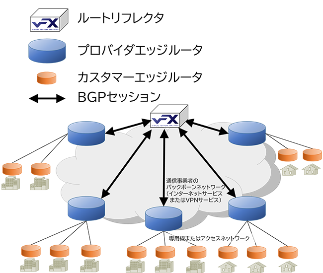 通信事業者のバックボーンネットワークにおけるインターネットサービス網やVPNサービス網で、BGP経路を集約する際に「vFX-R」を利用することができます。これにより、各ルータが保持すべきBGPセッションの数を減らすことで、各ルータにかかる負荷を軽減し、サービスの安定性強化と運用コストの削減を支援します。
