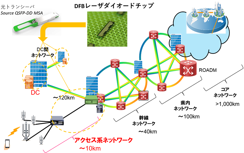 また当社は、DFBレーザダイオードチップをはじめ、長距離通信向け信号用レーザーダイオードモジュール(ITLA)や励起用レーザーダイオードモジュールなど幅広い光源ラインナップを提供しており、基幹系ネットワークからデータセンタおよびアクセス系ネットワークまで、広範囲にわたる高機能光ネットワークの実現を支えています。