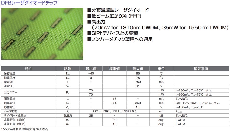 当社は2000年からDFBレーザダイオードチップを製造しており、世界トップクラスの高光出力特性と高信頼性技術に定評を得ています。