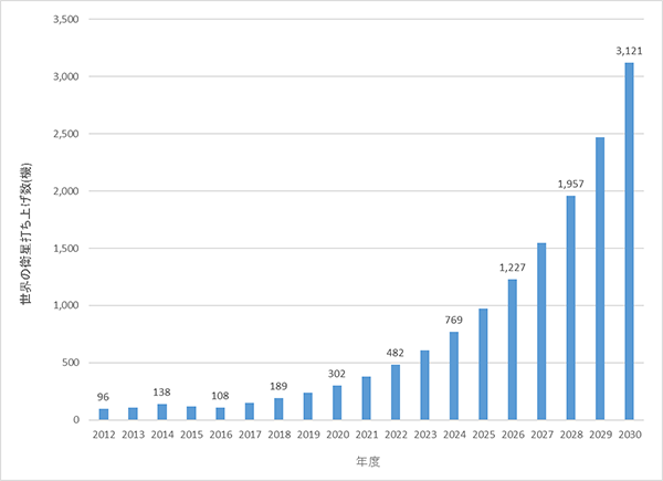 世界の500kg以下の小型人工衛星打ち上げ数(内閣府資料をもとに古河電工作成)