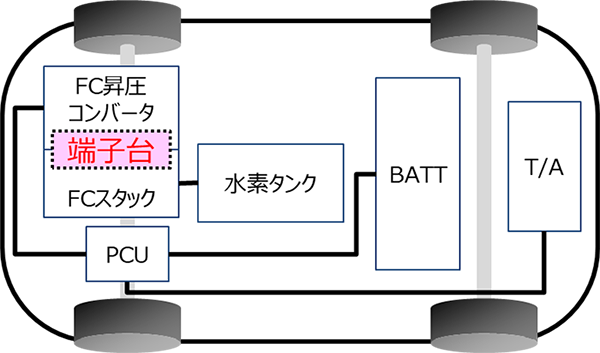 今回納入した高圧配電部品モジュールは、システムを構成するFCスタック(注2)や昇圧コンバータ内部の部品間を電気的に接続し、高電圧・大電流の電力を配電するモジュールです。FCスタックは燃料電池車の発電装置で、生み出された電力はFC昇圧コンバータで最大650Vに昇圧された後、PCUなどの機器に分配されています。
