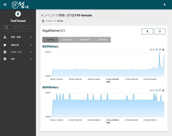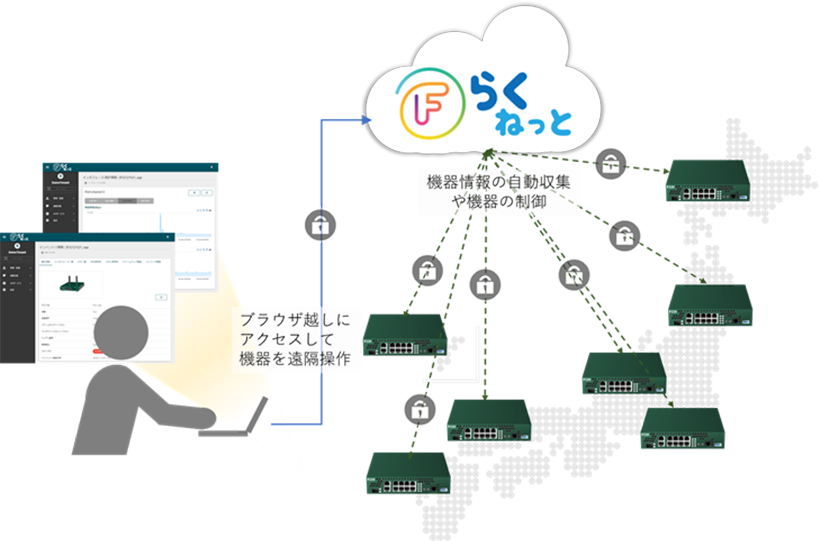 Fらくねっと®は、ネットワークを構築する複数のFITELnet®ルータをクラウド上で統合管理し、装置状態やトラフィック量の監視、機器の設定やファームウェアの履歴管理・一括変更などを管理画面上で簡単に安全に行うことができるクラウドサービスです。Fらくねっと®から各拠点に配置されたFITELnet®ルータを一元的に管理・監視することで、ネットワーク管理者の負担を大幅に軽減します。