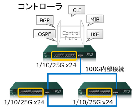 また、複数台を1台の装置として運用可能とするクラスタ機能に対応予定です。最大4台構成で1G / 10G / 25Gを96ポート搭載、最大800Gbpsを予定しています。