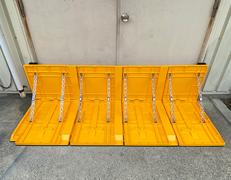 - 水害時の浸水対策として注目される樹脂製止水板で、当社技術を活用した折り畳み式の製品を開発