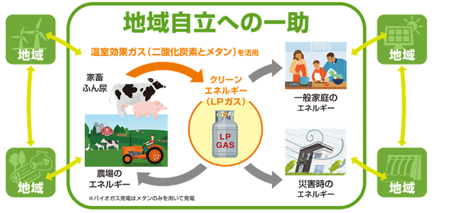 当社は社会課題解決型事業の創出をマテリアリティ(経営上の重要課題)に掲げ、脱炭素社会・循環型社会の実現に貢献する「環境配慮事業の創出」に取り組んでいます。家畜のふん尿から貯蔵・輸送が容易なLPガスを創出することで、一般家庭や酪農場などの産業の現場でエネルギーとして用いることができるほか、災害用のエネルギーとしても利用でき、地産地消型のエネルギーとなります。当社は、地方自治体など多くのパートナーの皆様との共創により、地産地消型のエネルギーを用いた地域の新しい社会基盤構築を通して脱炭素社会の実現に貢献します。