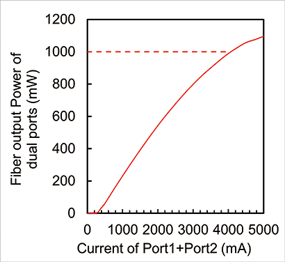 現在の主力製品である500mW出力のFOL1439Rシリーズに搭載されるチップを用いて試作した電流-光出力特性(レーザ温度35℃、図2)では、横軸が2ポート分の全駆動電流に対し、縦軸が2ポート分のファイバ出力の合計値となっています。この結果から、FOL1439Rシリーズで500mW出力2台分の出力である1Wの出力が1台のモジュールから得られていることが確認できます。また、レーザ温度35℃/ケース温