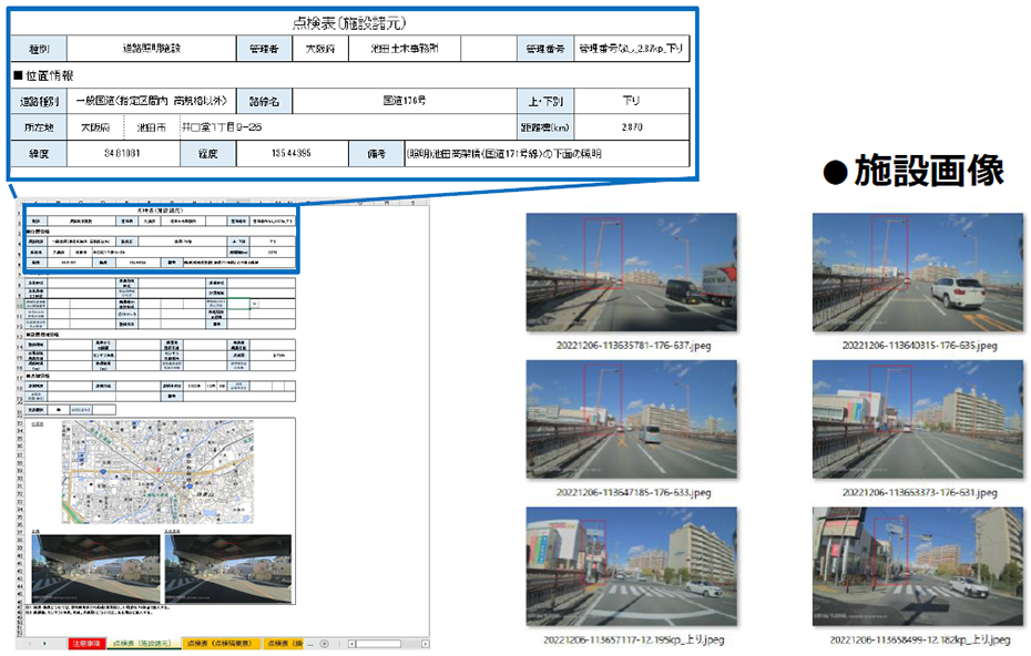 本実証実験では、2020年に国から大阪府へ移管された国道176号の兵庫県境~大阪市境の区間(兵庫県川西市小戸2丁目~大阪府大阪市淀川区新高3丁目)の約12.3kmを対象として、ドライブレコーダーを搭載した車両を走行させて動画を取得し、みちてん®シリーズを用いた動画解析により、点在する道路案内標識・道路照明施設(約650基)の位置情報を抽出し、デジタルの点検表(施設諸元)および一覧表を自動作成しました。