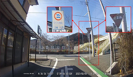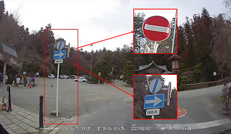 - 一本の標識柱に対して多方向に標識板が設置されるケースにおいても、正面方向だけではなく側面方向・背面方向に設置された標識板を判別・取得できました(図1・2)。さらに取得した標識板については、付随する補助板も含め記載文字が判読できることを確認しました。