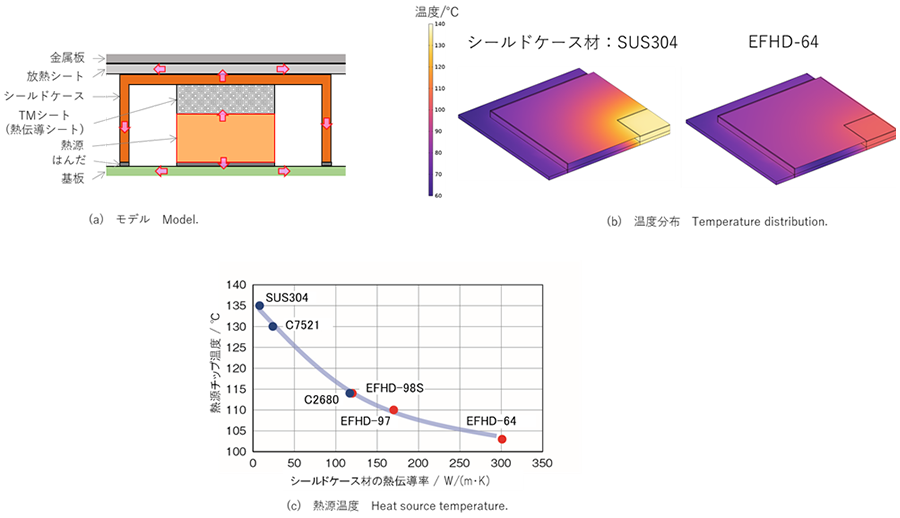 用途の一例として、電磁波シールドケースとして使用する場合の有効性に関するシミュレーションでは、基板上に実装されたシールドケース周辺をモデル化(底部の基板から上部の金属板まで7層で構成)し(図2-a)、4Wの熱源を設定した際のモデルの温度を計算しました。その結果、従来の材料である熱伝導率の低いステンレス鋼(SUS304)は高温のヒートスポットが生じているのに対し、熱伝導率の高いEFHD-64は熱を拡散(図2-b)するため、シールドケースの材料の熱伝導率が向上することにより熱源の温度が抑えられることが分かりました(図2-c)。従来のステンレス鋼などからEFHD®シリーズへ置き換えることで、効率よく放熱・拡散して内部のICの温度が下がることで、動作の安定化が見込めます。