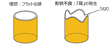 当社独自の結晶方位制御技術を用いて圧延条特有の異方性(長手方向と幅方向で機械的特性が異なること)を低減することにより、円筒絞りの課題であった「耳」(注)の発生を抑制し、絞り加工性を改良しました(図1)。このたびの改良では、旭精機工業株式会社(本社:愛知県尾張旭市旭前町新田洞5050-1、代表取締役社長:神谷真二)との共創により、深さ/直径比が10を超える絞り加工を実現し、寸法精度(真円度)の高い加工が可能であることを確認しました(図2)。