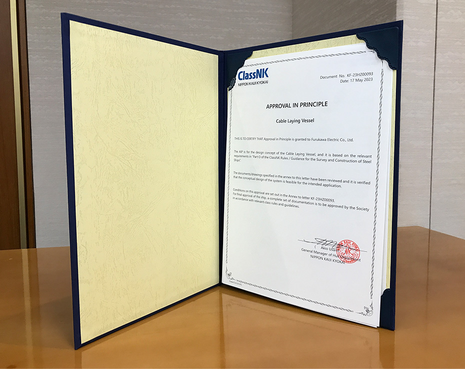 古河電気工業株式会社(本社:東京都千代田区大手町2丁目6番4号、代表取締役社長:森平英也)は、CLV開発合同会社(本社:神奈川県横浜市中区山下町2番地、代表取締役社長:植木圭紀(注1))と協同し、国立研究開発法人新エネルギー・産業技術総合開発機構(NEDO)のグリーンイノベーション基金(GI基金)事業「海底ケーブル布設専用船(Cable Laying Vessel: CLV)開発プロジェクト」にて開発を進めている新しいケーブル布設船に係る基本設計承認(Approval in Principle: AiP)を、一般財団法人日本海事協会(本部:東京都千代田区紀尾井町4番7号、会⾧:坂下広朗)より取得しました。