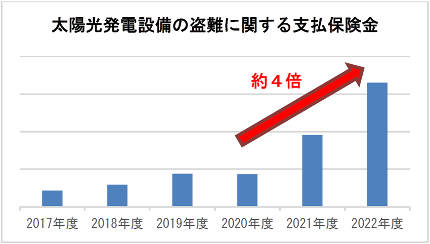 世界的に銅の価格高騰が続いていることを背景に、銅導体ケーブルを大量に使用する太陽光発電設備における大規模窃盗事件が相次いでいます。犯人の検挙も進んでいますが、それ以上に窃盗団数が急増していることから、損保ジャパンでは、太陽光発電設備の盗難に起因する2022年度の支払保険金は2020年度の約4倍に増加し、太陽光発電設備に関する大きなリスクとなっています。