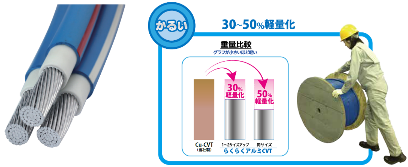 らくらくアルミケーブル®とは、導体にアルミニウム、絶縁被覆に柔軟性架橋ポリエチレンを採用した高機能型低圧CVケーブルです。「かるい」「かんたん」「柔らかい」に加えて、「識別容易」「安定価格」といった特長があります。端末処理を安心して行っていただけるよう、専用圧縮・圧着端子、端子台、端末処理の専用工具をご用意し、らくらくアルミケーブルシステム®としてケーブルからつなぎ込みまでを一貫したシステムとしてお客様に提案しています。