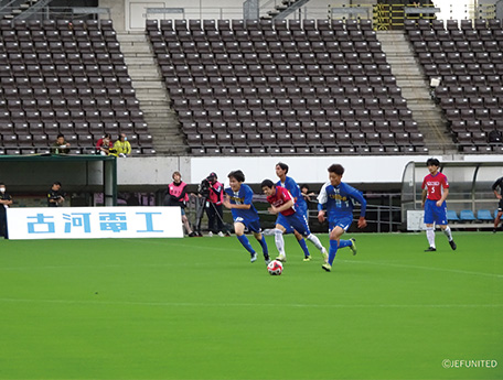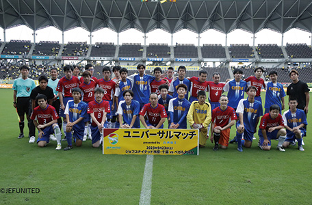 9月23日に、フクダ電子アリーナ(千葉県千葉市)にて、明治安田生命J2リーグ 第36節ジェフユナイテッド市原・千葉vsベガルタ仙台戦の前座試合として、「ユニバーサルマッチ presented by 古河電工」が開催されました。千葉県知的障がい者サッカー選抜とFCトラッソス(東京都内知的障がい児・者のサッカーチーム)が、公益財団法人日本サッカー協会競技規則2023/24に準じ、前・後半15分ハーフの計30分の真剣勝負を行い、結果は、4-0で千葉県知的障がい者サッカー選抜が勝利しました。選手たちは、日ごろの練習の成果を発揮し、観客のいるフクダ電子アリーナで思う存分サッカーを楽しんでいる様子でした。試合後には、ジェフユナイテッド市原・千葉のユニフォームデザインをモチーフにしたオリジナルランドリーバッグを寄贈しました。