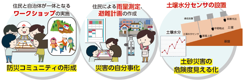 - 実証実験ではワークショップを通じて地区防災計画の作成を支援し、自助・共助・公助の連携を強化