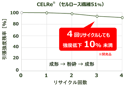 マイクロオーダーのセルロース繊維を分散したCELRe®はベース樹脂(ポリプロピレン)より弾性率が向上し、熱膨張率が低下します。また、粉砕・成形を繰り返しても強度低下が少なく(4回で10%未満、図2)マテリアルリサイクルが可能です。