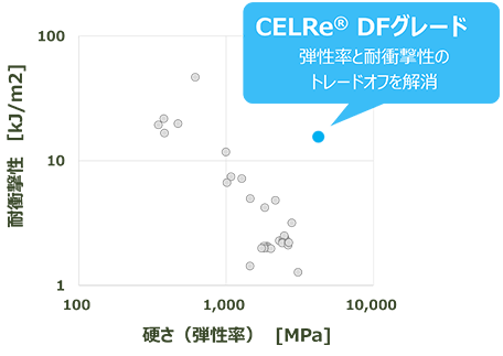 CELRe®は、従来のプラスチック成形機・金型で射出成形が可能で(図3)、セルロース繊維を51%含有するCELRe® KCPグレードの他、強度と耐衝撃性を両立したCELRe® DFグレード(図4)を展開します。耐衝撃性を改善したDFグレードは、従来のセルロース繊維強化樹脂が適用できなかった製品への適用が期待されます。