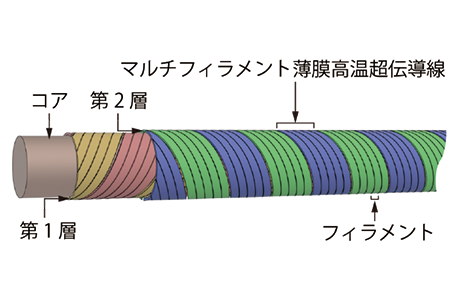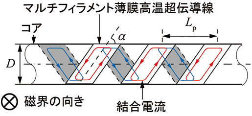 マルチフィラメント薄膜高温超伝導線のフィラメントの上を銅でめっきしフィラメント同士を電気的に接続すると、磁界がかかったときに銅を介して結合電流という一種の渦電流が流れ、この結合電流が減衰しない限りは、フィラメントに分割したことによる交流損失低減効果が損なわれてしまいます。銅めっきマルチフィラメント薄膜高温超伝導線をコアのまわりにらせん状に巻き付けることで結合電流を速やかに減衰させ、交流損失の低減効果を維持できるようになります。
