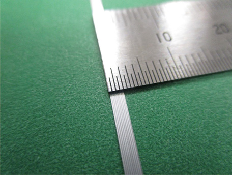 古河電工とSuperPower Inc.が製造したマルチフィラメント薄膜高温超伝導線(幅2ミリメートル、厚さ0.05ミリメートル、フィラメント10本)です。製造工程の途中の銅めっき前の様子で、10本のフィラメントが見えています。
