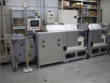 京都大学に設置された、コイルを作ることができるような長いSCSCケーブルを作るための装置です。写真で、向かって右側の巻き枠からコアを送りだし、そのまわりに銅めっきマルチフィラメント薄膜高温超伝導線を巻き付けていき、巻き付け後、ケーブルを左側の巻き枠に巻き取っていきます。