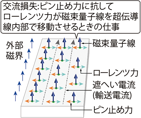 交流損失は、磁束が細い線(磁束量子線)となって超伝導体の中に侵入し移動するときに発生する摩擦発熱のようなものです。ピン止め力 (摩擦力に相当)に逆らいながらローレンツ力(フレミングの左手の法則による力)によって磁束量子線が動くときに発生します。交流損失が大きいと、超伝導線の温度が上昇して超伝導状態を保てなくなる可能性があるほか、除熱のために必要な電力が、電気機器の効率を低下させてしまいます。