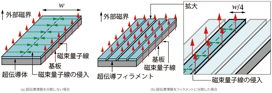超伝導薄膜を細いフィラメントに分割すると、磁束量子線の移動する距離が短くなり、磁束量子線が移動するときに発生する摩擦発熱のようなものである交流損失も小さくすることができます。