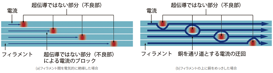フィラメント同士を完全に電気的に絶縁すると、万一、あるフィラメントに超伝導ではない部分(不良部)があったときに、電流が迂回できず、そのフィラメントは全く電流を流すことができなくなってしまいます。マルチフィラメント薄膜高温超伝導線のフィラメントの上を銅でめっきしフィラメント同士を電気的に接続すると電流が迂回できるようになります。