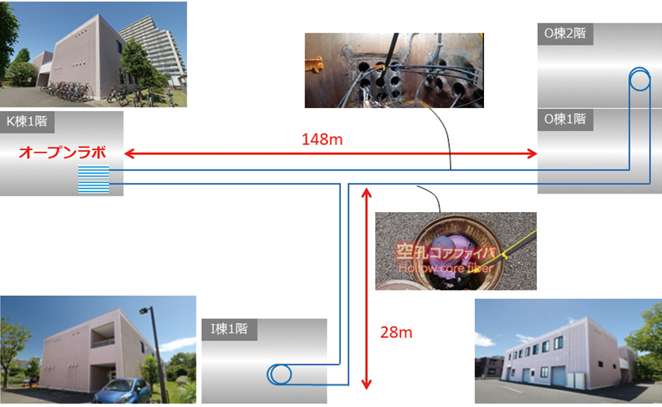 慶應義塾大学(塾長 伊藤公平)と古河電気工業株式会社(代表取締役社長 森平英也、以下「古河電工」)は、総務省「グリーン社会に資する先端光伝送技術の研究開発」プロジェクト(補足1)の一環として、空孔コアファイバケーブルを慶應義塾大学新川崎タウンキャンパス内の「慶應義塾大学未来光ネットワークオープン研究センター」(以下、「本センター」)に敷設し、複数のビル間を結ぶ超低遅延ネットワークキャンパスの実験を開始しました。これにより、世界で初めて慶應義塾大学内外のエンジニア達が実用に近い環境で空孔コアファイバの実験をできる施設が完成しました(図1)。