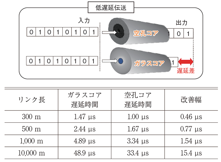 空孔コアファイバは、従来のガラスコア光ファイバとは異なる光閉じ込め原理により、ガラスよりも屈折率の低い空孔のコアに光を閉じ込めて伝搬する新しいタイプの光ファイバです(図2)。従来のガラスコア光ファイバと比較して30%以上の低遅延化と1.5倍の通信速度(信号伝送速度の限界である光速と同程度)を実現し(図3、(補足3・4・5))、Beyond5G時代に本格化する自動運転や遠隔ロボット(遠隔手術)、金融などの高速取引といったサービスの実現において極めて重要な超低遅延性を有しています。