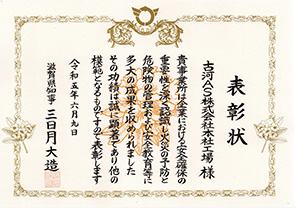 ~ 過去20年の無災害継続と従業員への防災安全教育等の取り組みが評価 ~
