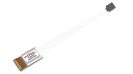 この度開発した16チャンネルブラインドメイト型外部光源には、当社製の高出力DFB(Distributed Feedback)レーザ素子と光学部品を高密度に実装した8チャンネルTOSAを2台搭載しています(図1、2)。8チャンネルTOSAのサイズは22.5 mm(長さ)×13.0 mm(幅)×3.3 mm(厚み)と小さく、TOSAの偏波保持ファイバは曲げ損失や偏波消光比の劣化なくハウジングに収納できるようにMTコネクタまでの長さを短く調整しています。本製品の駆動特性は、ハウジング温度範囲25℃~55℃において、全チャンネルで100mW以上の光出力特性と、20dB以上の偏波消光比を達成しています。