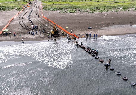 本事業は、株式会社JERAと株式会社グリーンパワーインベストメントが保有する特別目的会社(SPC)合同会社グリーンパワー石狩を通じて建設・運営され、清水建設株式会社が日鉄エンジニアリング株式会社と組成した共同企業体が洋上風車設置等の洋上部工事を担当しました。当社は、洋上部工事元請の清水建設株式会社より、風車間の接続および風車から陸上へ送電する総延長約16㎞におよぶ海底ケーブルシステムの設計・製造・布設を一括で請け負いました。