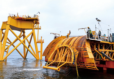 風車の基礎構造は、現地海域の自然条件・布設条件・風車仕様などを踏まえた最適な構造としてジャケット式が採用されました。海底ケーブルは、このジャケット式基礎に設置された管路(J-Tube)を通じて引き込まれ、風車間を連系するとともに発電電力を陸上の電力網へ送電する重要なキーコンポーネントです。