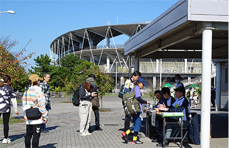 はじめに、ウォーキングフットボールのルール説明と緊張をほぐすためのアイスブレイクを行った後、10チームを編成して2ゲーム行いました。参加されたほとんどの方が「走らない」「ボールを取りに行かない」というルールのウォーキングフットボールは初体験のようでしたが、慣れてくるとチーム内で声を掛け合い、アイコンタクトをとりながらプレーし、点数が入ると手を挙げて喜ぶ姿が見られました。また、イベントの合間にジェフユナイテッド市原・千葉のキャプテン鈴木大輔選手がサプライズで訪れ、イベントを盛り上げました。イベント終了後には、参加者全員に記念品としてジェフユナイテッド市原・千葉のエンブレムと当社のロゴが入ったオリジナルミニタオルを寄贈しました。