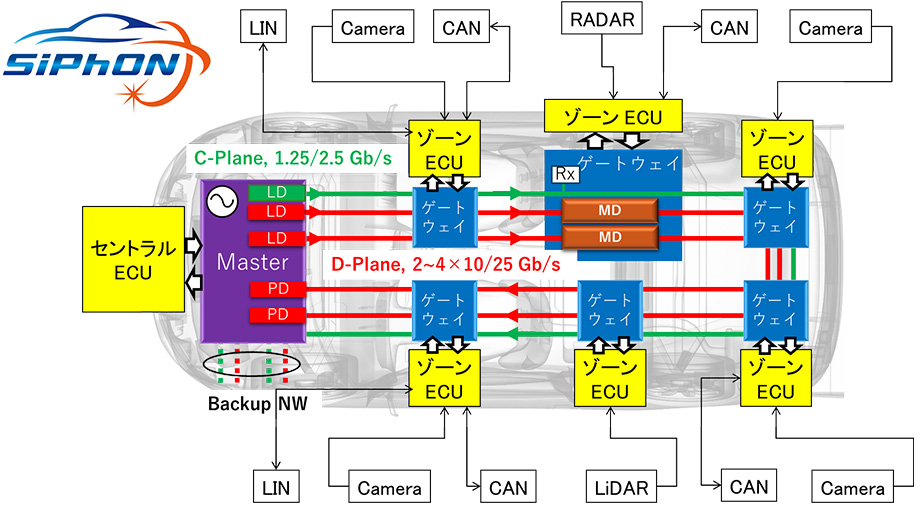 - 完全自動運転の基盤となる、シリコンフォトニクス素子(注1)を利用した100Gb/sの伝送容量を持つ高信頼車載光ネットワークSiPhONを提案しました。