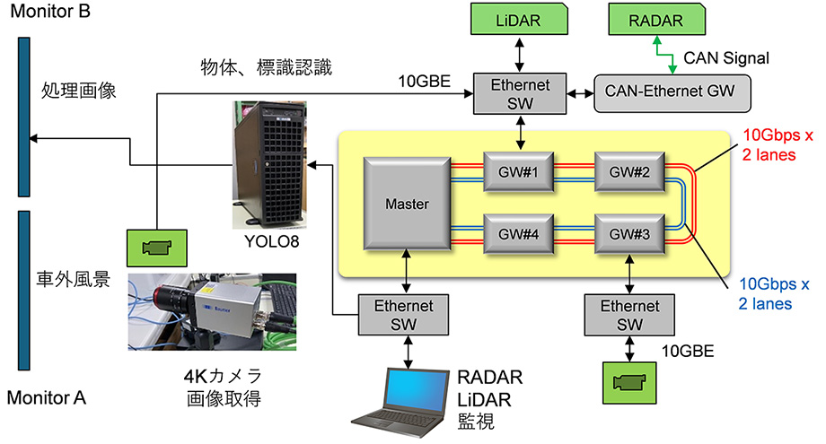 このたび車載ネットワークを模擬したデモンストレーションシステムを構築しました(図2)。マスター装置と4台のゲートウェイ装置間で2台の4Kカメラの映像信号(各10Gb/s)と周辺監視レーダおよびLidarの低速データを同時に伝送し、低遅延なエラーフリー伝送を実証しました。4Kカメラで取得された情報は、SiPhONを介して画像処理装置に伝送され、物体・交通標識を認識した結果がリアルタイムで表示されます。