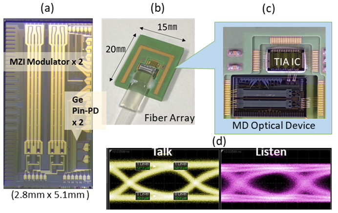 ゲートウェイ装置用シリコン細線シリコンフォトニクス変調器・光受信器集積デバイス(MD光回路)の開発を行いました。