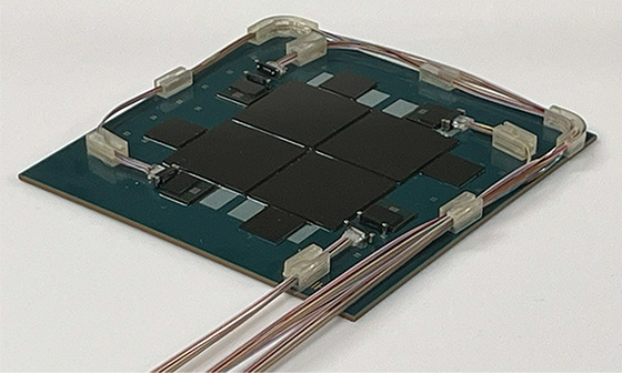 本開発品は光ファイバ同士を接続する小型多心光コネクタとしても使用することができます。また、次世代の光電融合形態への適用が期待されるガラス導波路基板への高密度実装もできるほか(図3)、16心などのより多心の構造にも適用可能です。さらに、現在40心の光コネクタの開発も進めています。