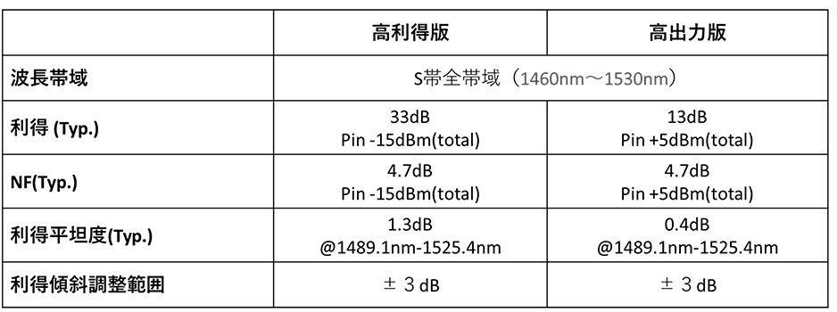 - S帯の光信号(70nmの波長帯域)を利得30dB以上、利得平坦度0.4dB以下で増幅することに成功