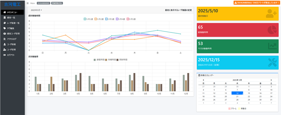 | インフラレーザ®ダッシュボード | PC・タブレットからアクセス可能なWebアプリケーションで、装置ごとの稼働状況やメンテナンス予定をカレンダー形式やグラフ形式で表示します。装置やパーツの状態把握、収集データのCSVダウンロード、ランニングコストの試算(開発中)により、効率的な機器運用を支援します。 |
