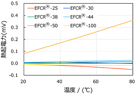 EFCR®-50:体積抵抗率は49μΩ・cmで、標準電気抵抗線や温度測定用熱電対等に用いられている抵抗材料Cu-Ni系合金と同等の特性を持ち代替可能であるとともに、温度変化に対する熱起電力(図3)がCu-Ni系合金(80℃における熱起電力が3mV)より低いため、直流精密抵抗器にも最適です。