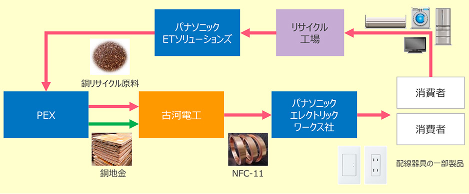 本スキームではパナソニックのグループ企業であるパナソニックETソリューションズ株式会社が、リサイクル工場で解体・選別された銅リサイクル原料を、分離選別工程の精緻化で不純物を少なく高品位に分別し、古河電工と連携して成分分析値のクロスチェックを実施しました。これによりPEXは、銅リサイクル原料を銅精錬メーカーに戻すことなく、古河電工に直接供給し、古河電工は、銅地金と一部置き換えても諸特性が安定する製造条件を新たに確立し、配線器具用銅合金NFC-11の製造におけるCO2発生量を約8%低減することに成功しました。従来からNFC-11を製造する古河電工の日光伸銅工場(栃木県日光市)では、同グループが所有する水力発電によるクリーンエネルギーを100%使用し、環境負荷の少ない銅製品を提供しており、NFC-11をパナソニック製品(注)に使用することで「銅の資源循環」と「CO2排出量の削減」を同時に実現します。