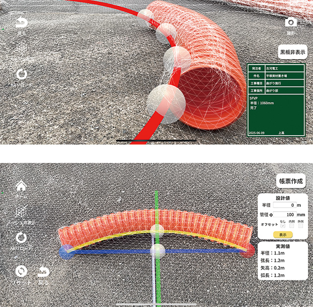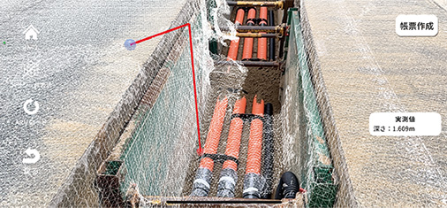 - iPhone/iPad搭載のLiDAR機能・AR技術を活用し、曲がり配管の曲率半径や掘削溝の深さを測定