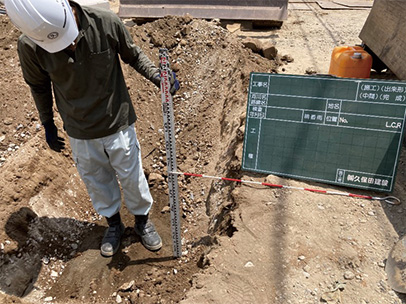 施工現場では、曲がり配管の線形管理や掘削溝の寸法測定を行う必要がありますが、作業者は掘削溝に降りて検測棒や測深棒などを用いた手法で測定しているため負担が大きく、これに代わる効率的で非接触型の測定方法が求められています。